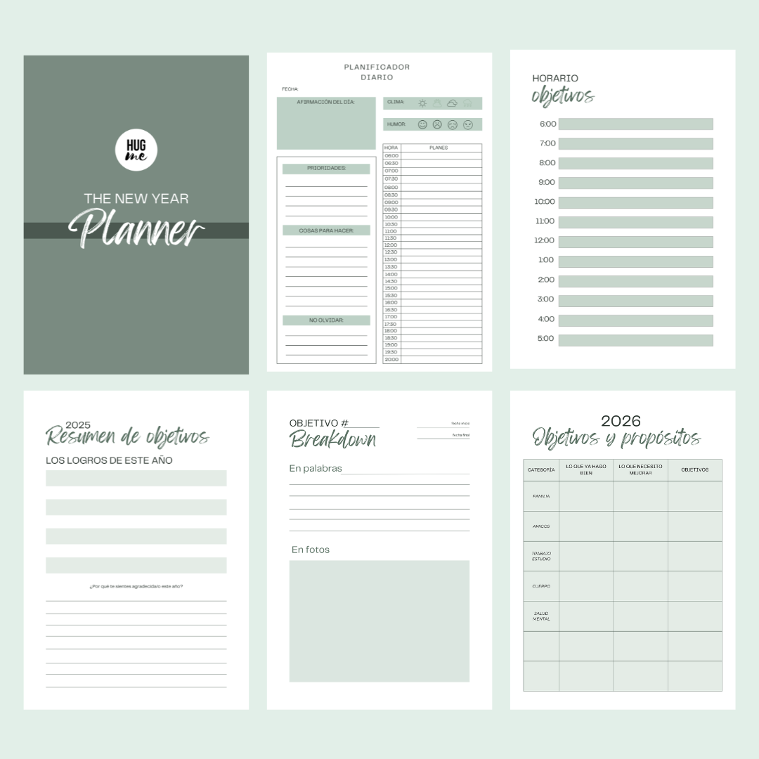 El Planner de Año Nuevo de Hugme está diseñado para ayudarte a cerrar el año con conciencia y empezar el siguiente con intención.